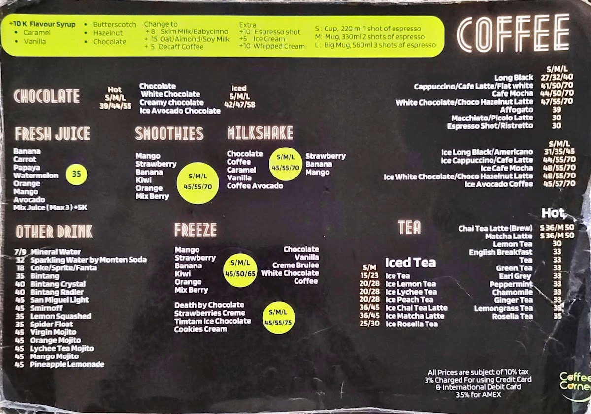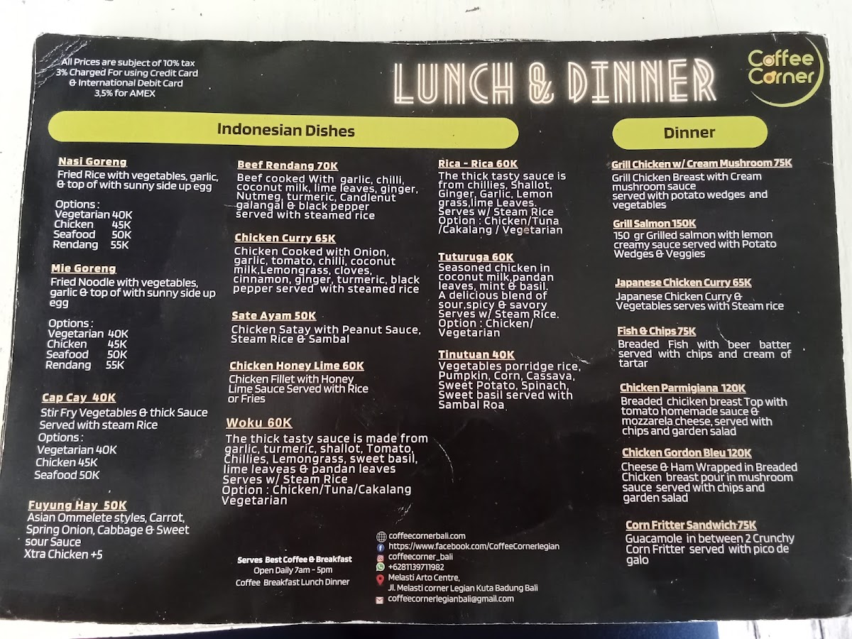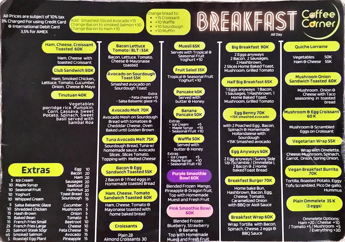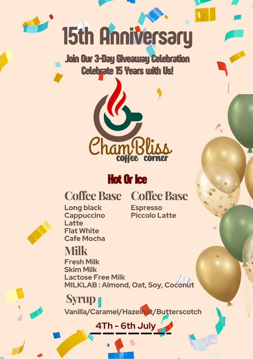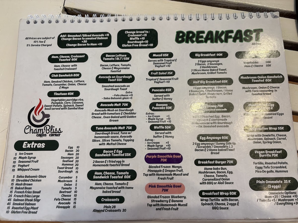 The menu at ChamBliss Coffee Corner offers a relaxed blend of comforting breakfast classics, casual bites, and a variety of thoughtfully prepared drinks. Whether you’re starting the day early or looking for a midday pick-me-up, you’ll find nourishing options like a Big Breakfast with eggs any style, flavorful Indonesian dishes such as Nasi Goreng Ayam Telor Mata Sapi, and fresh fruit-based choices like smoothie bowls and fruit salad.